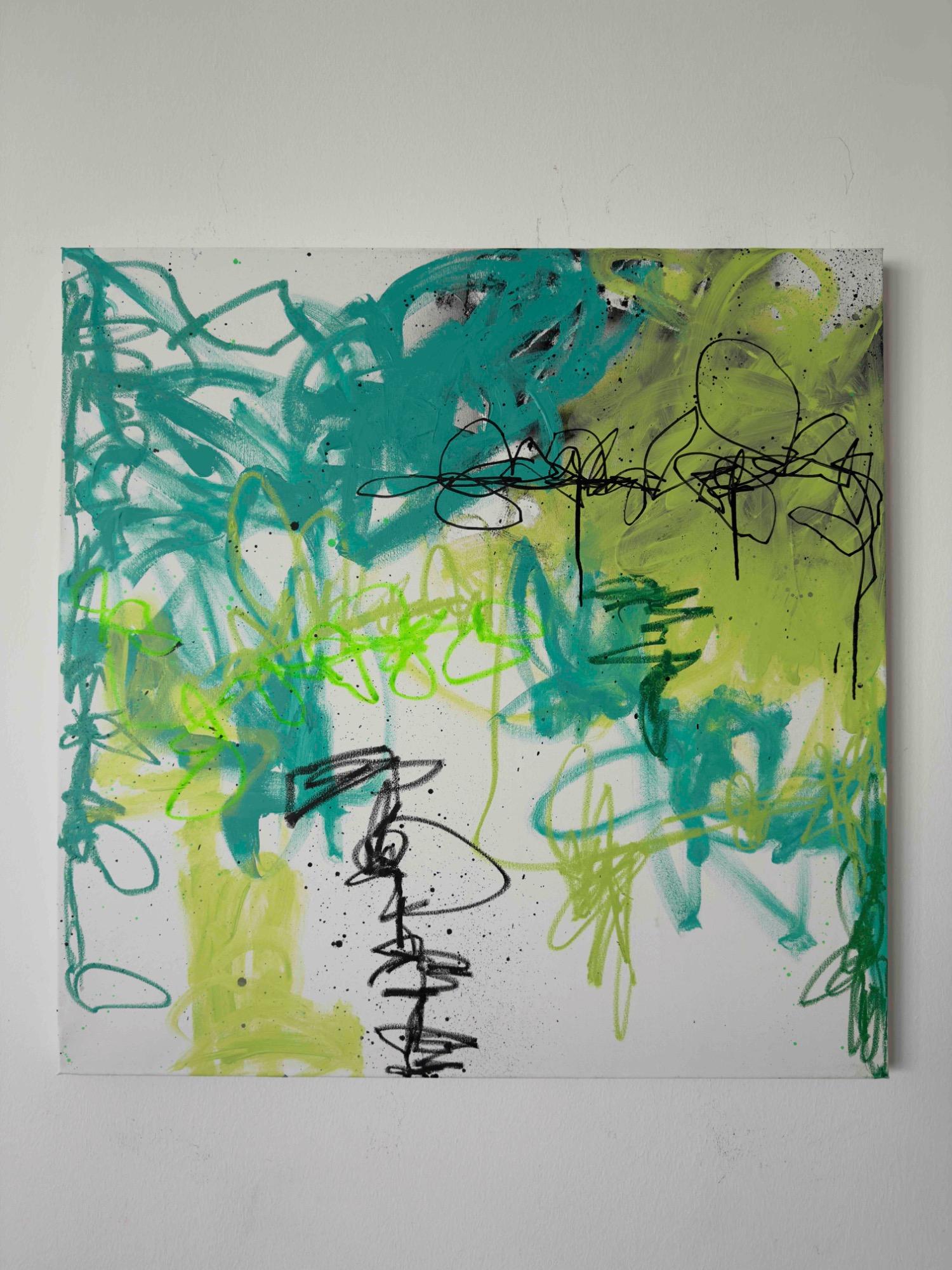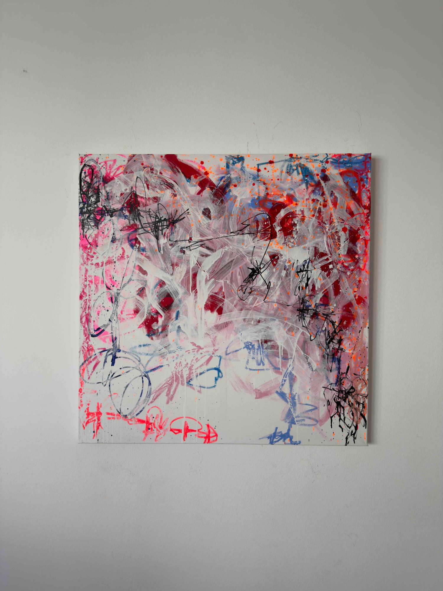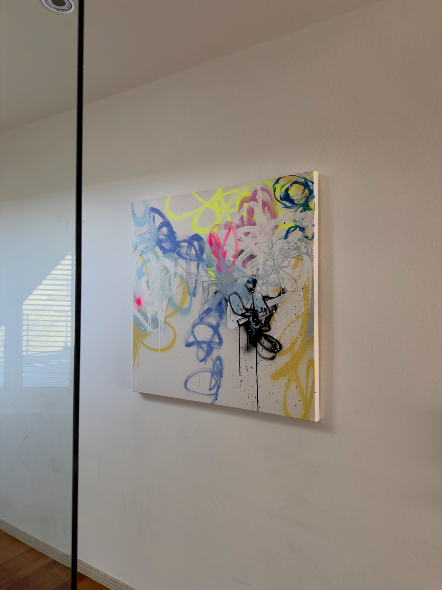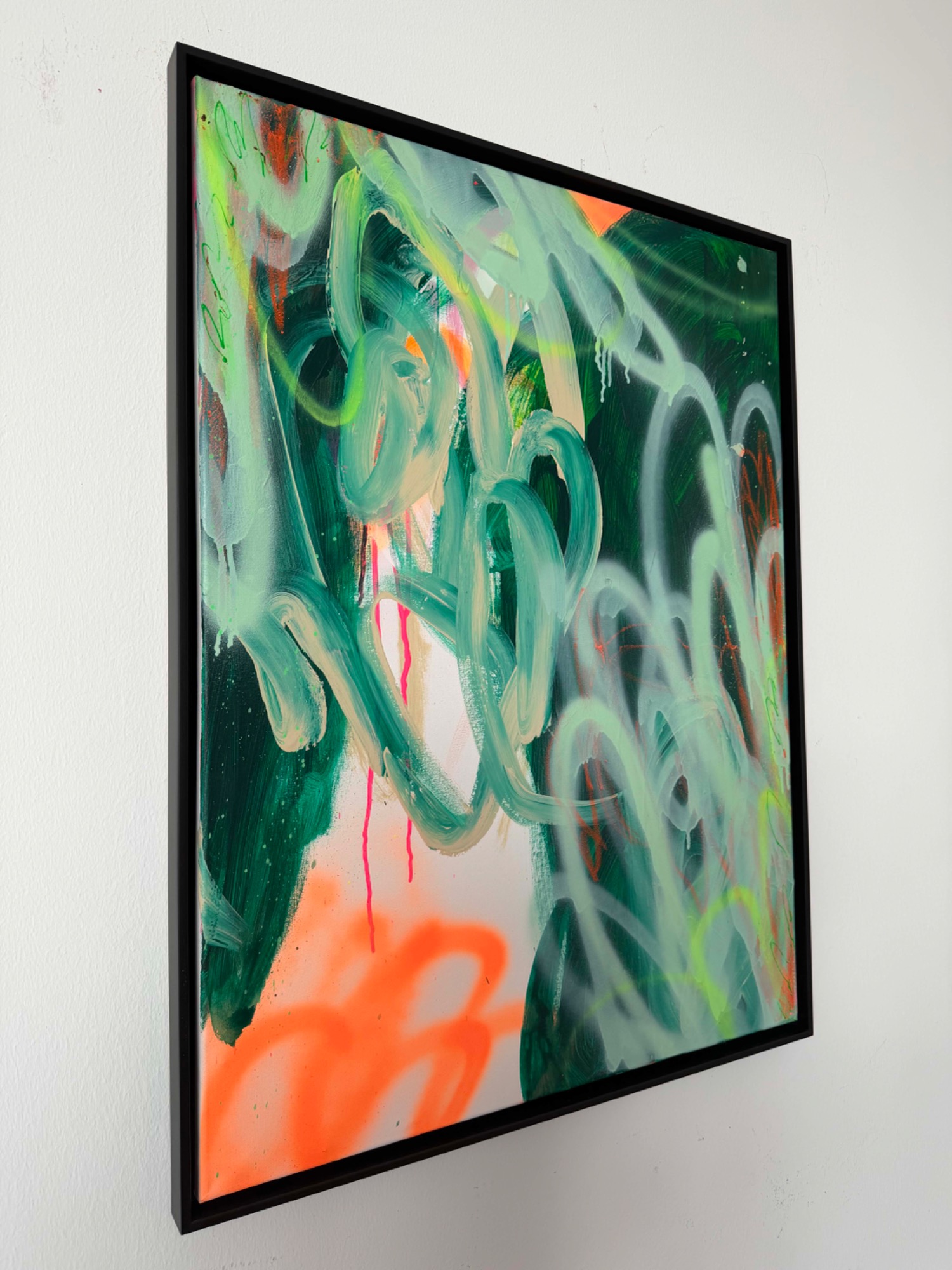 Weiße Schlieren ziehen sich wie Wolken durch das Werk. Wie Dunst über einer Stadt, die nie ganz schläft. Urbane Nacht, Street Vibes, Spuren von Energie. Und mittendrin etwas, das sich entscheidet zu wachsen.