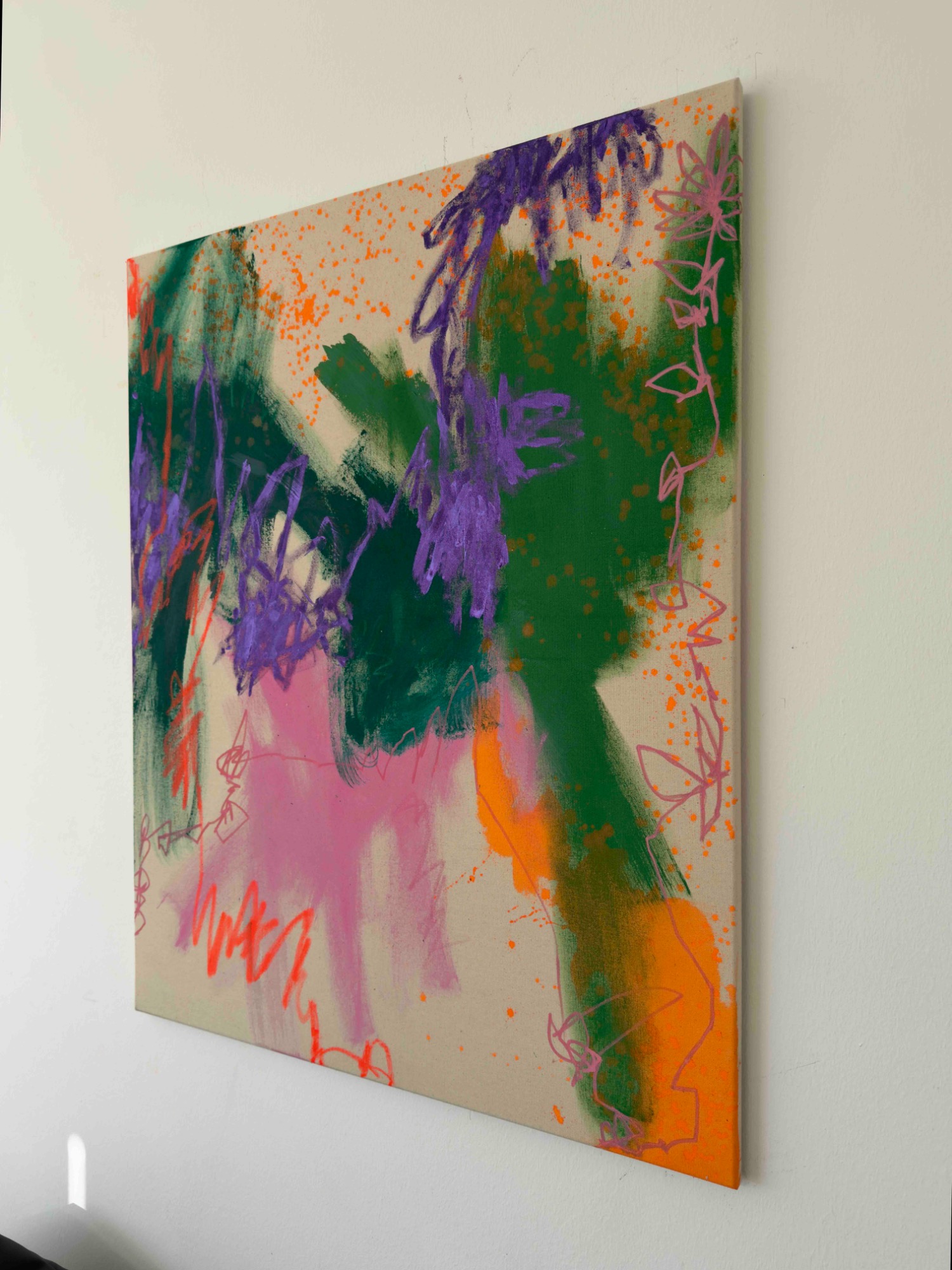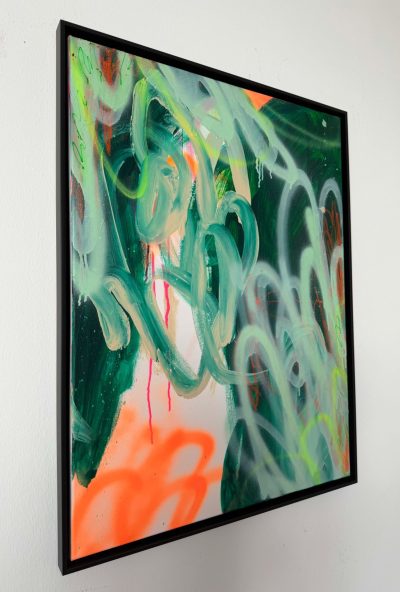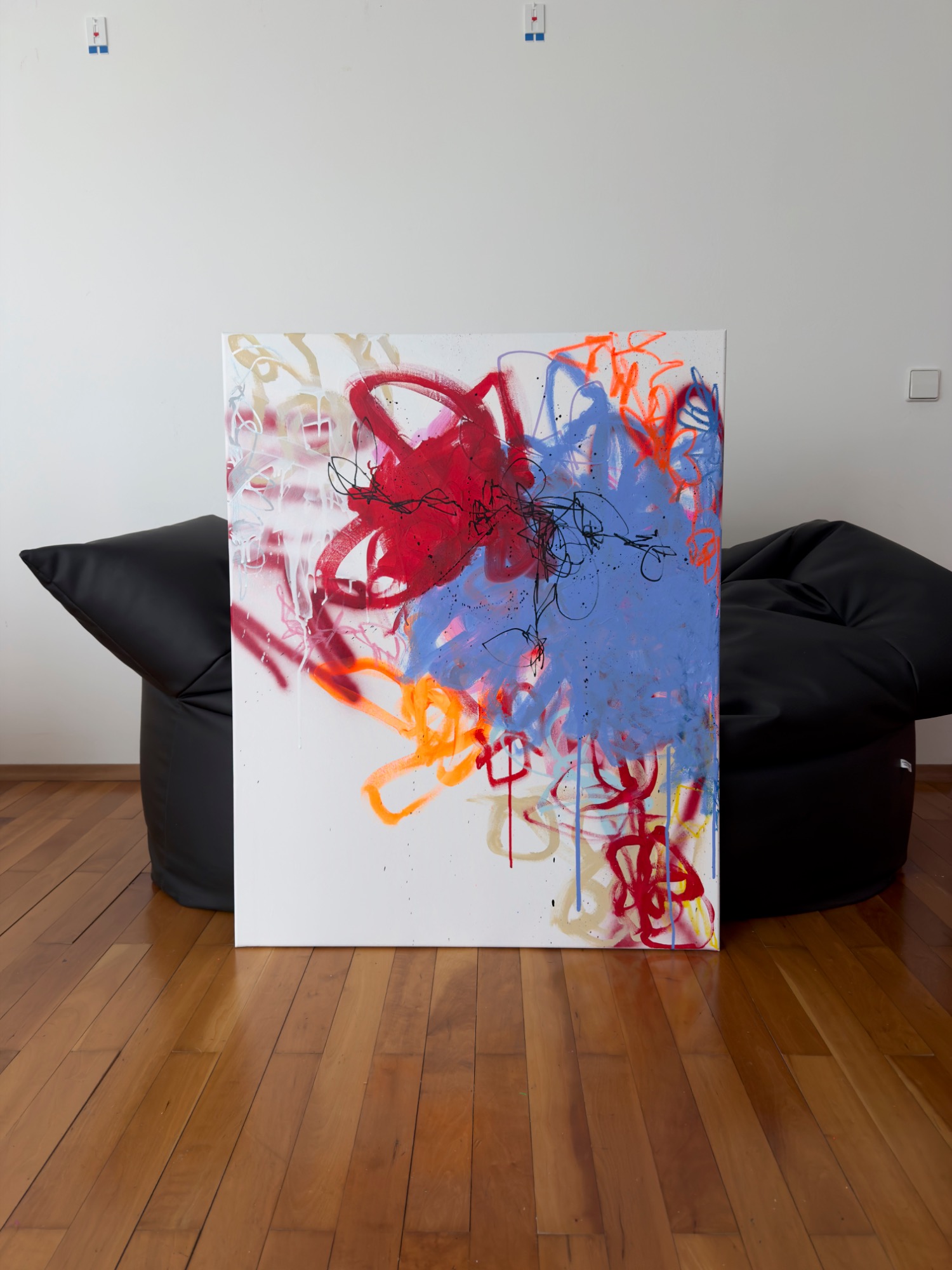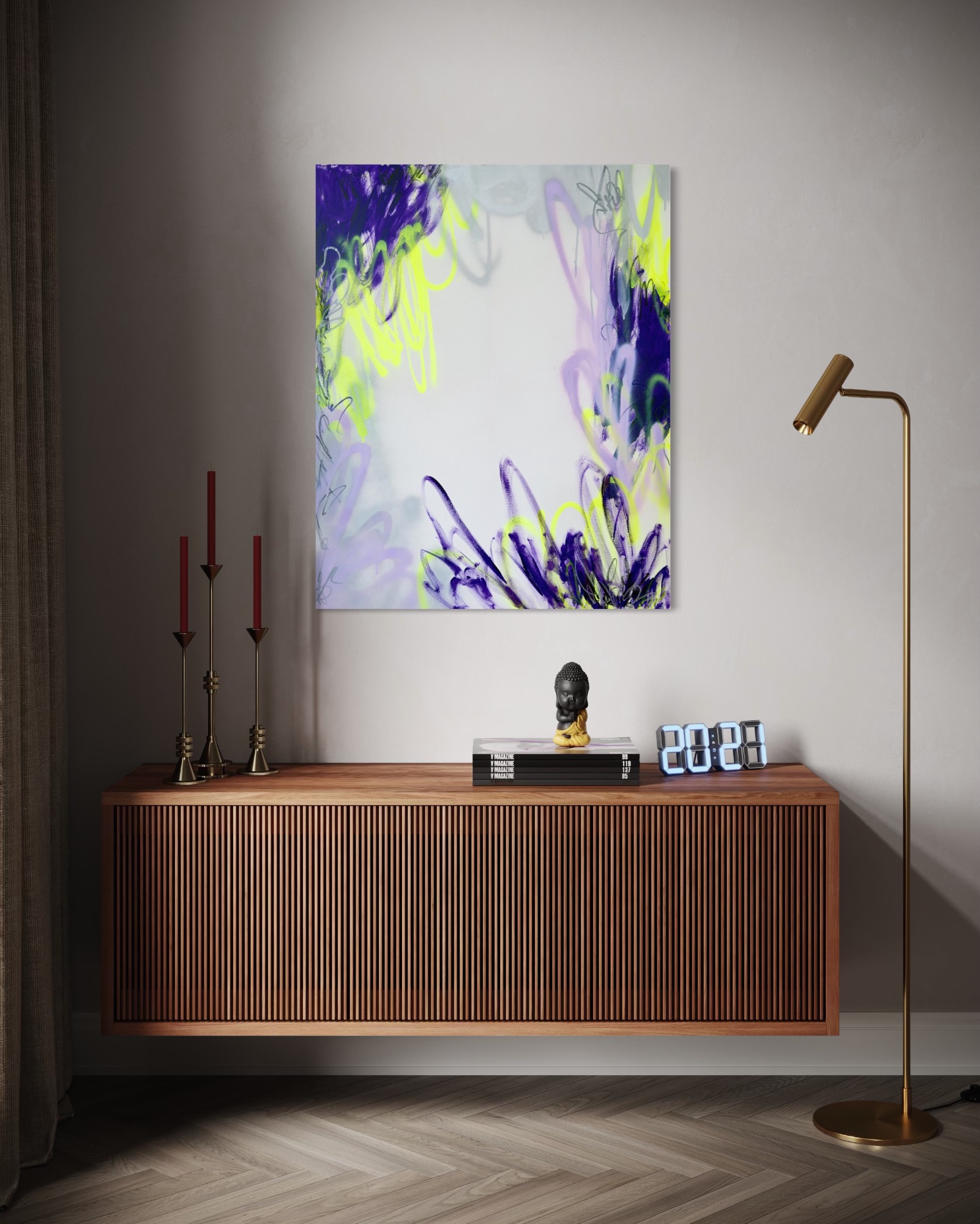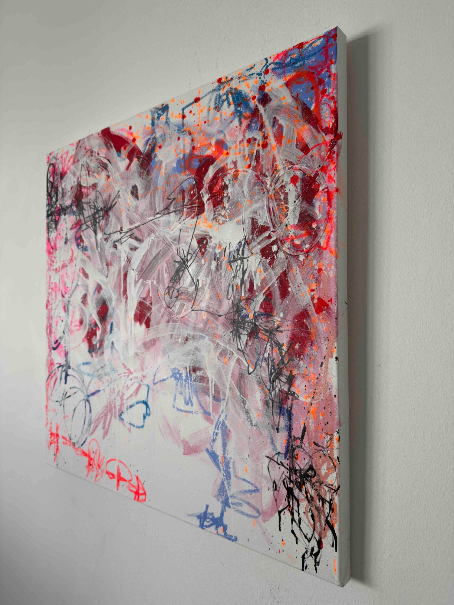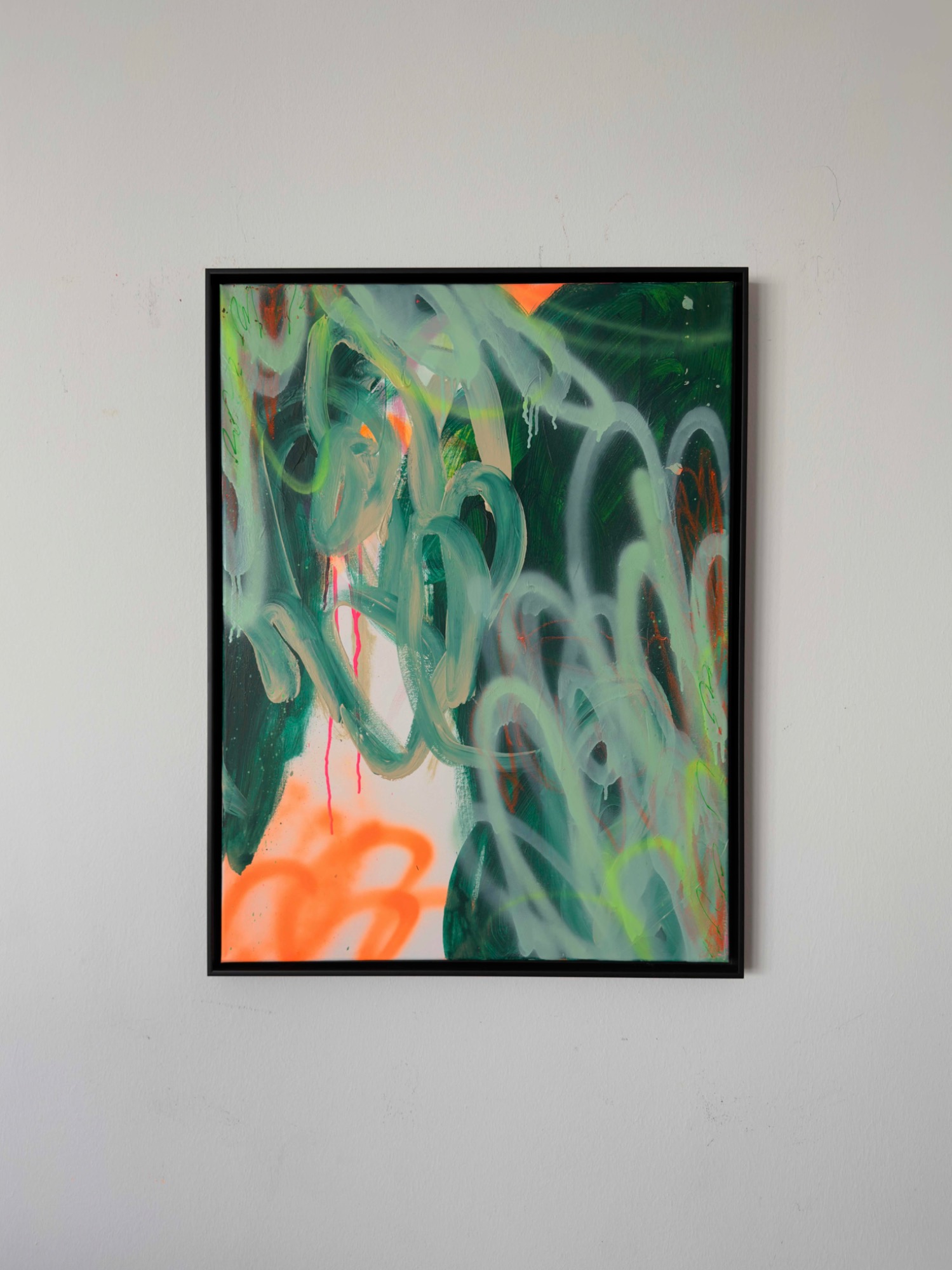 Weiße Schlieren ziehen sich wie Wolken durch das Werk. Wie Dunst über einer Stadt, die nie ganz schläft. Urbane Nacht, Street Vibes, Spuren von Energie. Und mittendrin etwas, das sich entscheidet zu wachsen.