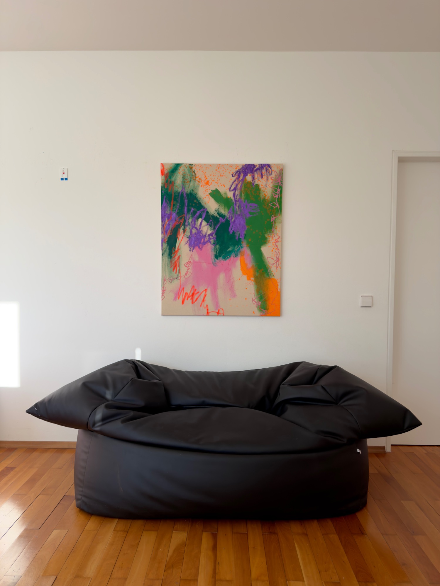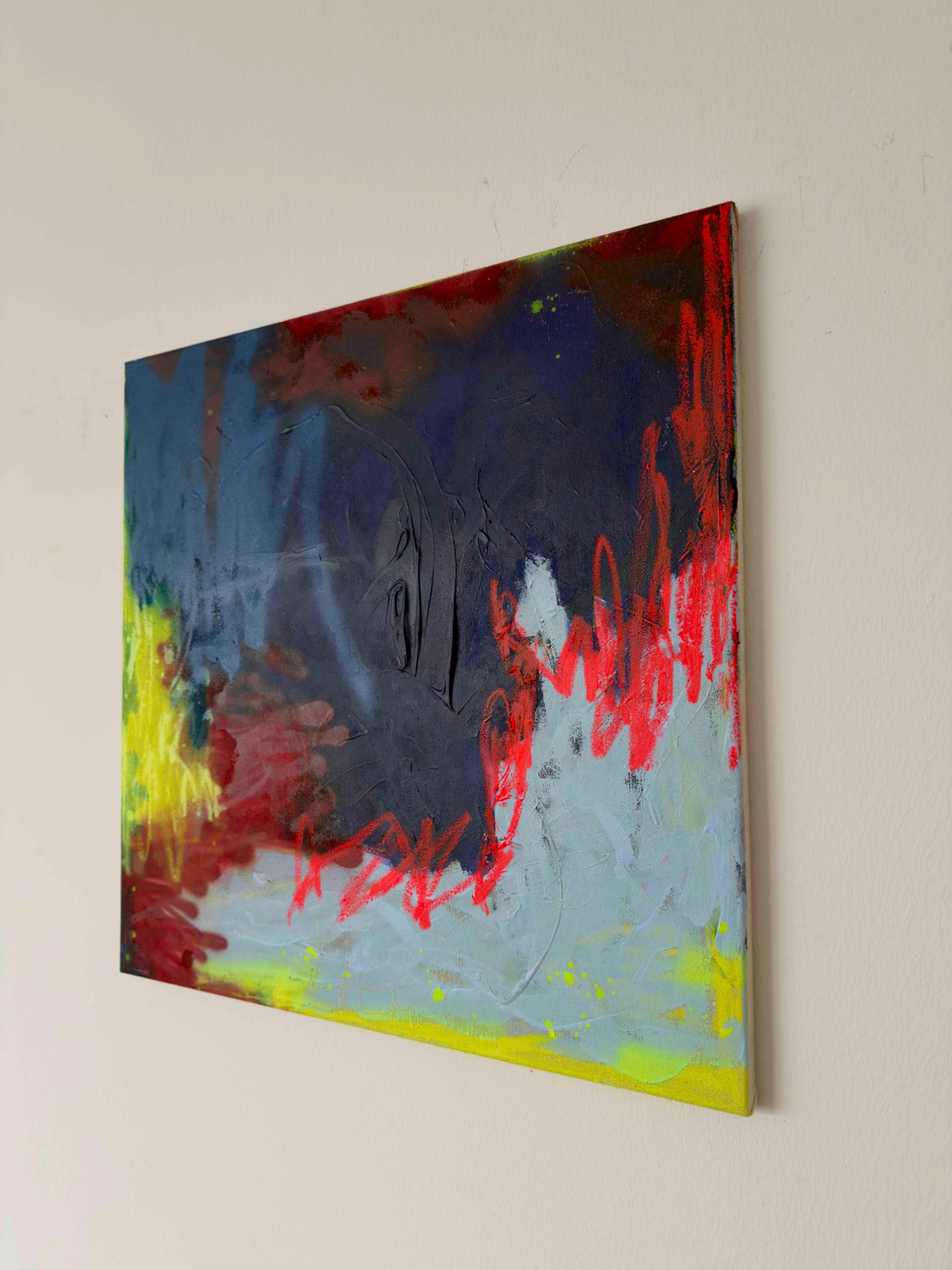 VON LICHT UND DUNKELHEIT bringt genau diese Gegensätze auf die Leinwand. Tiefe, dunkle Flächen treffen auf Neonakzente, rohe Spuren auf weiche Übergänge. Nichts ist klar getrennt, alles greift ineinander. So wie im echten Leben.