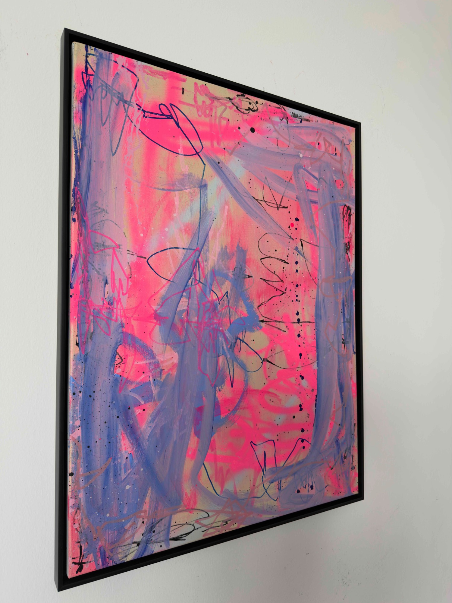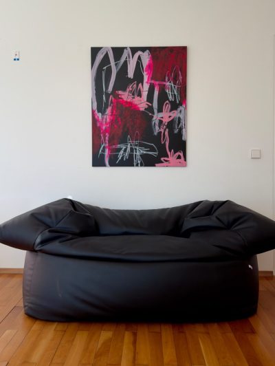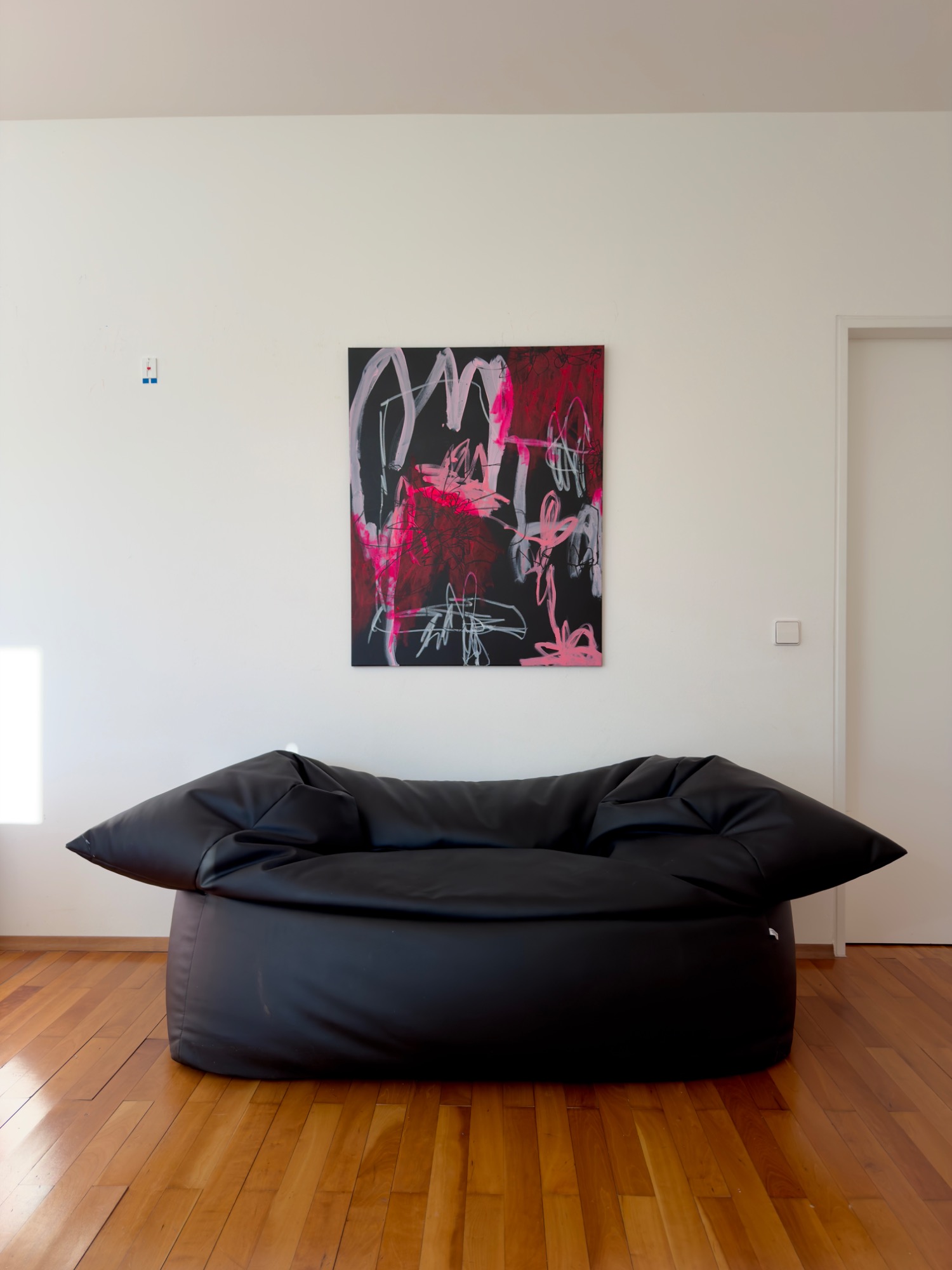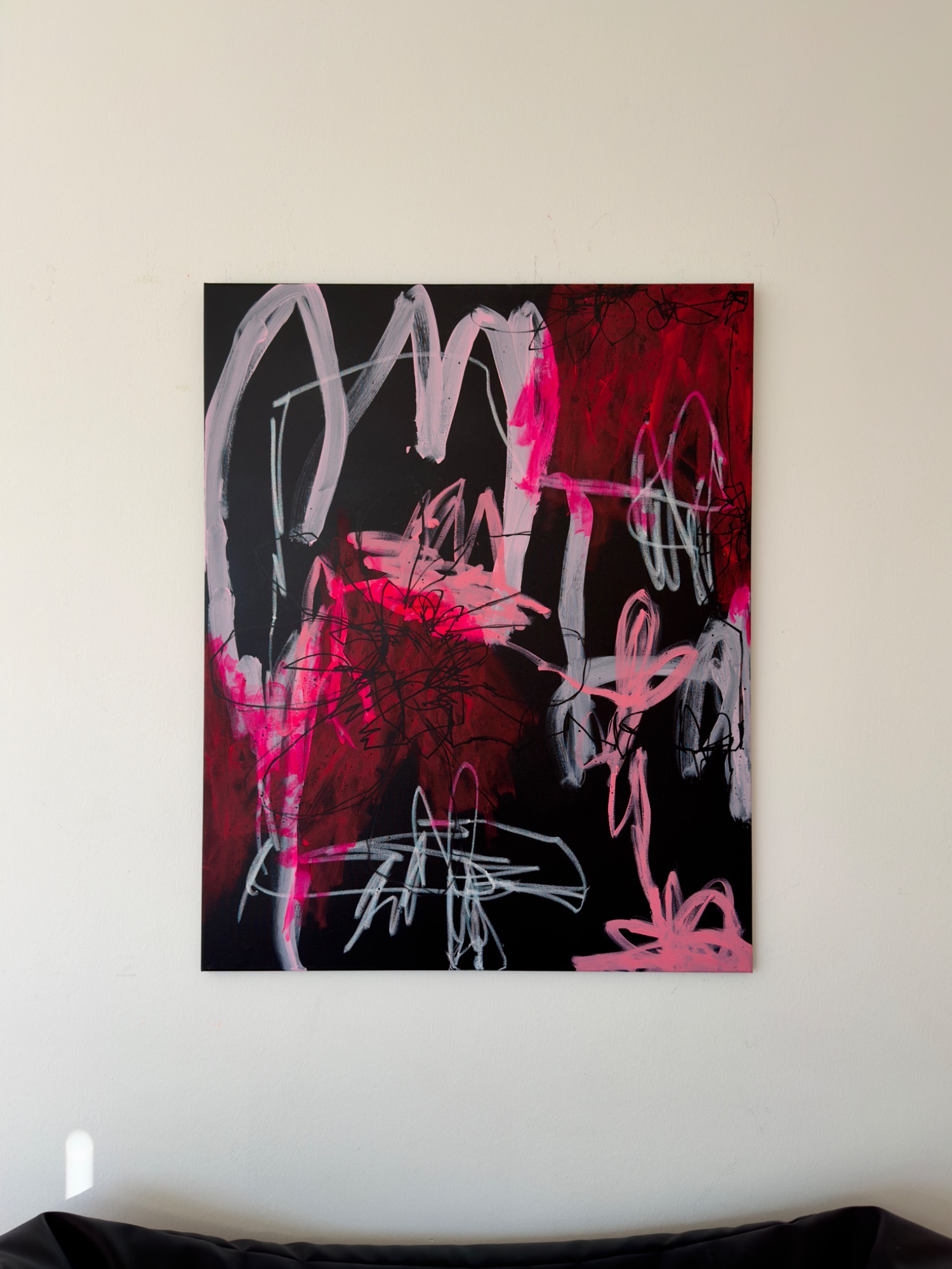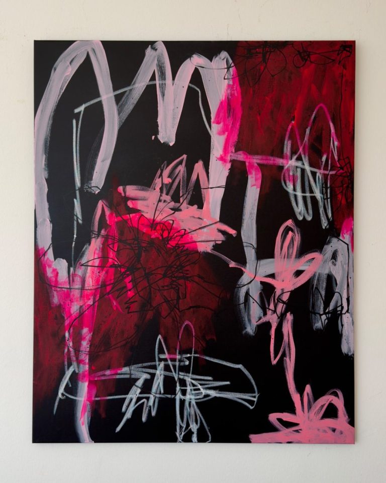Vor dem tiefen Schwarz des Hintergrunds bricht Farbe hervor. Neonpink, Rosa und Weiß wirken wie ein Aufleuchten oder ein lebendiger Impuls.